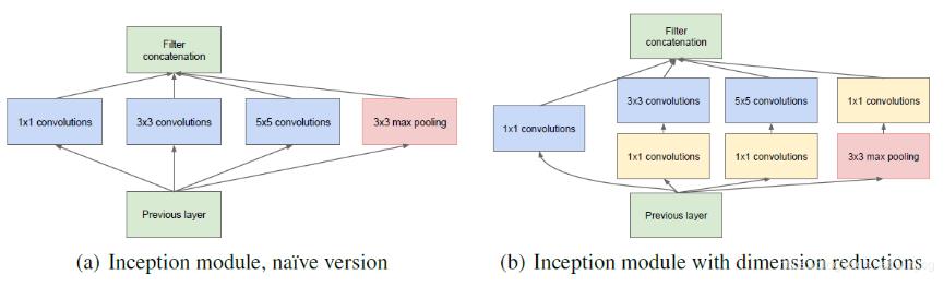 最重要的创新点就在于使用inception模块,通过使用不同维度的卷积提取不同尺度的特征图。左图是最初的Inception模块,右图是使用的1×1得卷积对左图的改进,降低了输入的特征图维度,同时降低了网络的参数量和计算复杂度,称为inception V1。