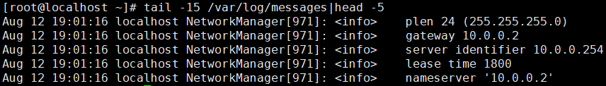 练习:使用head和tail配合管道符,输出/var/log/message倒数10到15行内容
