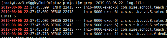 有些时候我们也会遇到一些希望查看某个时间段日志信息的需要,这个时候可以利用grep这条命令来实现这个功能,例如说希望查看2019-08-06 22点这一个小时以内的日志信息,那么可以输入以下命令: