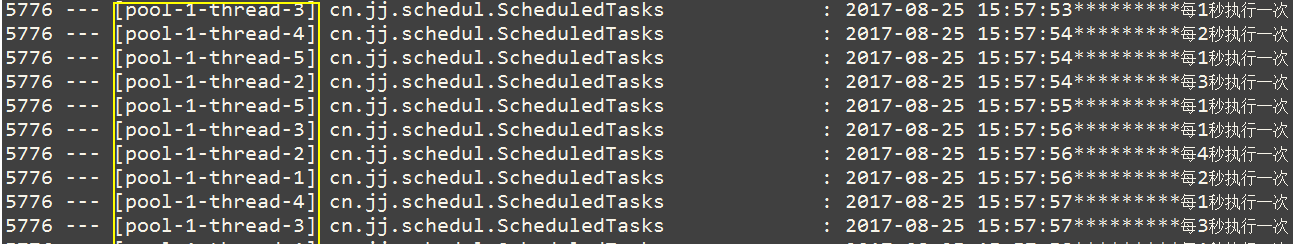 这样就完成了多线程并发的配置?我们启动项目通过控制台输出信息验证一下结果,最后发现所有的任务都在同一个线程池但不同线程中完成,说明这个方案完全可行,这样,我们就完成了spring boot 多线程并发定时任务。