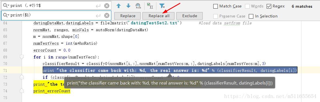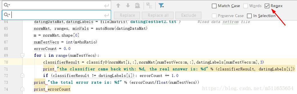 1、在pycharm编译器中,Ctrl+R调出替换功能框,勾选“Regex”,选择正则表达式替换方法