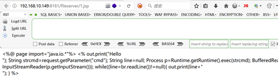 2、浏览器访问http://192.168.10.149:8161/fileserver/1.jsp,下图可以看到fileserver目录下的webshell没有被解析,说明fileserver目录没有执行权限