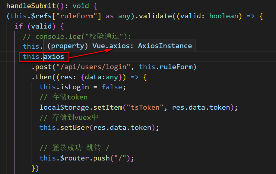 从上面我们可以看出vue-axios帮助我们实现了在Vue原型身上挂载axios,而且能够被ts检测到。这样就完美避免了ts报错的问题。