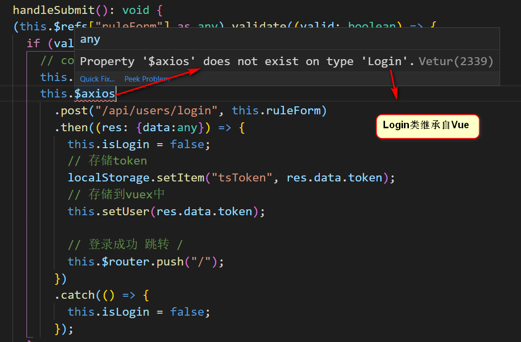 这样的话,我们在各个组件中进行请求时,就可以直接使用this.$axios,但是在ts中使用this.$axios进行请求时,会进行报错,如下所示: