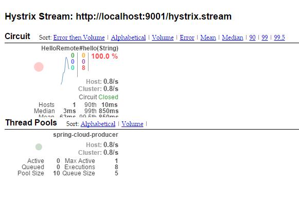 data: {"type":"HystrixCommand","name":"HelloRemote#hello(String)","group":"spring-cloud-producer","currentTime":1494915453986,"isCircuitBreakerOpen":false,"errorPercentage":100,"errorCount":1,"requestCount":1,"rollingCountBadRequests":0,"rollingCountCollapsedRequests":0,"rollingCountEmit":0,"rollingCountExceptionsThrown":0,"rollingCountFailure":0,"rollingCountFallbackEmit":0,"rollingCountFallbackFailure":0,"rollingCountFallbackMissing":0,"rollingCountFallbackRejection":0,"rollingCountFallbackSuccess":1,"rollingCountResponsesFromCache":0,"rollingCountSemaphoreRejected":0,"rollingCountShortCircuited":0,"rollingCountSuccess":0,"rollingCountThreadPoolRejected":0,"rollingCountTimeout":1,"currentConcurrentExecutionCount":0,"rollingMaxConcurrentExecutionCount":0,"latencyExecute_mean":0,"latencyExecute":{"0":0,"25":0,"50":0,"75":0,"90":0,"95":0,"99":0,"99.5":0,"100":0},"latencyTotal_mean":0,"latencyTotal":{"0":0,"25":0,"50":0,"75":0,"90":0,"95":0,"99":0,"99.5":0,"100":0},"propertyValue_circuitBreakerRequestVolumeThreshold":20,"propertyValue_circuitBreakerSleepWindowInMilliseconds":5000,"propertyValue_circuitBreakerErrorThresholdPercentage":50,"propertyValue_circuitBreakerForceOpen":false,"propertyValue_circuitBreakerForceClosed":false,"propertyValue_circuitBreakerEnabled":true,"propertyValue_executionIsolationStrategy":"THREAD","propertyValue_executionIsolationThreadTimeoutInMilliseconds":1000,"propertyValue_executionTimeoutInMilliseconds":1000,"propertyValue_executionIsolationThreadInterruptOnTimeout":true,"propertyValue_executionIsolationThreadPoolKeyOverride":null,"propertyValue_executionIsolationSemaphoreMaxConcurrentRequests":10,"propertyValue_fallbackIsolationSemaphoreMaxConcurrentRequests":10,"propertyValue_metricsRollingStatisticalWindowInMilliseconds":10000,"propertyValue_requestCacheEnabled":true,"propertyValue_requestLogEnabled":true,"reportingHosts":1,"threadPool":"spring-cloud-producer"}