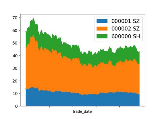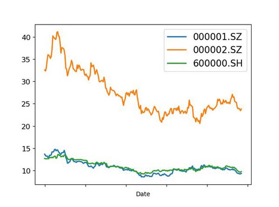 如果想要可视化多个时间序列数据,同样可以直接调用plot()方法。示例中我们从tushare.pro上面选取三只股票的日线行情数据进行分析。