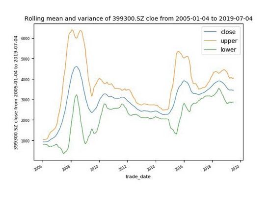 有时候,我们想要观察某个窗口期的移动平均值的变化趋势,可以通过调用窗口函数rolling来实现。下面实例中显示的是,以250天为窗口期的移动平均线close,以及与移动标准差的关系构建的上下两个通道线upper和lower。