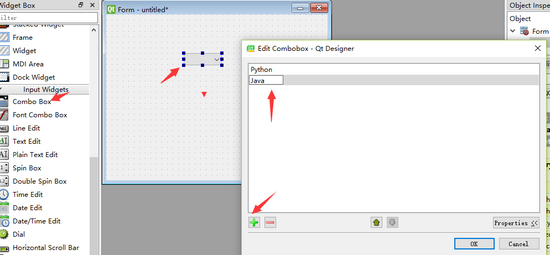 2、如果使用Qt Designer画图实现,可以将ComboBox控件添加到主界面后双击下拉列表框进行打开添加。如下: