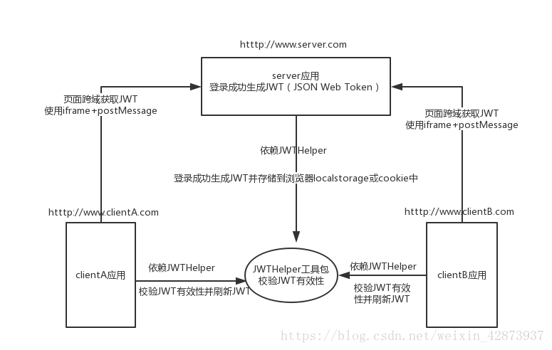 到此,后台服务的配置已经完成,下一步就需要前端页面将JWT令牌从response响应头中取出,然后存入localstorage或cookie中。但是遇到跨域场景,处理起来就会比较复杂,因为一旦在浏览器中跨域将获取不到localstorage中的JWT令牌。例如www.a.com域下的JWT,在www.b.com域下是获取不到的,所以我选择了一种页面跨域的方式进行处理,使用iframe+H5的postMessage(参考博文),具体我使用代码分享的方式来分析。