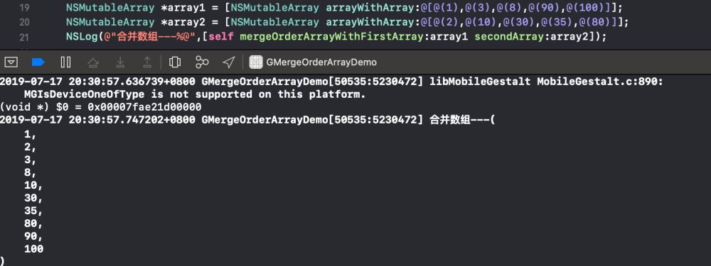 - (NSArray *)mergeOrderArrayWithFirstArray: (NSMutableArray *)array1 secondArray: (NSMutableArray *)array2 { // 全为空不处理 if (!array1.count && !array2.count) { return @[]; } // 一个为空返回另外一个 if (!array1.count) { return array2; } if (!array2.count) { return array1; } NSMutableArray *endArray = [NSMutableArray array]; while (1) { if ([array1[0] integerValue] < [array2[0] integerValue]) { [endArray addObject:array1[0]]; [array1 removeObjectAtIndex:0]; }else { [endArray addObject:array2[0]]; [array2 removeObjectAtIndex:0]; } if (!array1.count) { [endArray addObjectsFromArray:array2]; break; } if (!array2.count) { [endArray addObjectsFromArray:array1]; break; } } return endArray; }