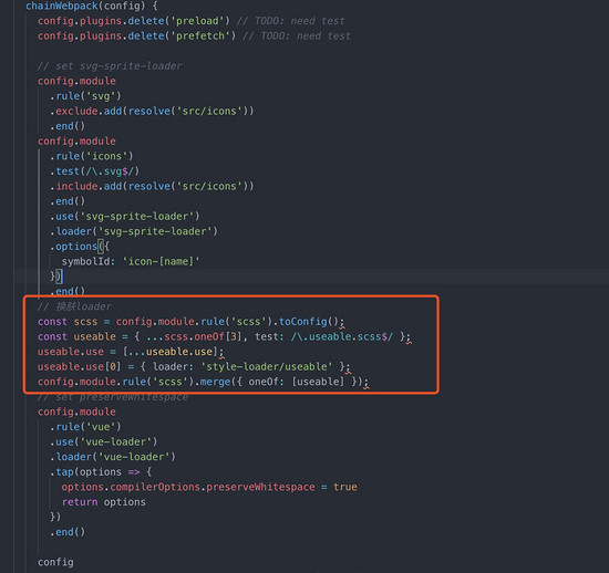 // 换肤loader const scss = config.module.rule('scss').toConfig(); const useable = { ...scss.oneOf[3], test: /\.useable.scss$/ }; useable.use = [...useable.use]; useable.use[0] = { loader: 'style-loader/useable' }; config.module.rule('scss').merge({ oneOf: [useable] });