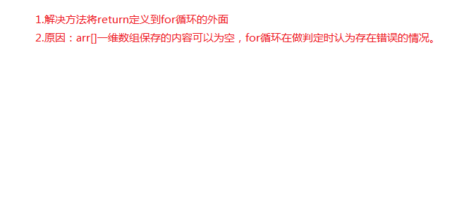 在数组内容为空的情况,程序是没有报错的,所以需要将return返回值定义到 for 循环之外即可。