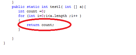 import java.util.*; import java.io.*; public class tt { public static void main(String[] args) { foo(); } public static String foo() { int i=0; while(i<10) { return "ggg"; } } }