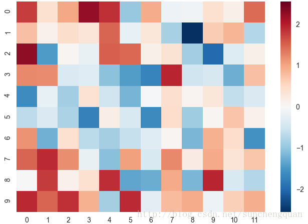 uniform_data = np.random.randn(10, 12) #为以0为中心的数据绘制一张热图 ax = sns.heatmap(uniform_data, center=0) plt.show()