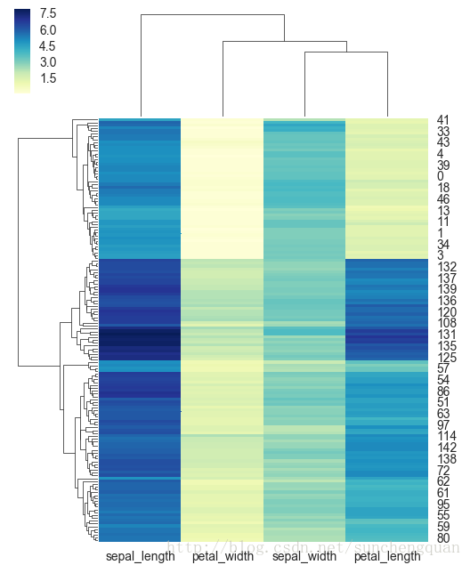 g= sns.clustermap(iris, fmt="d",cmap='YlGnBu',figsize=(6,9))