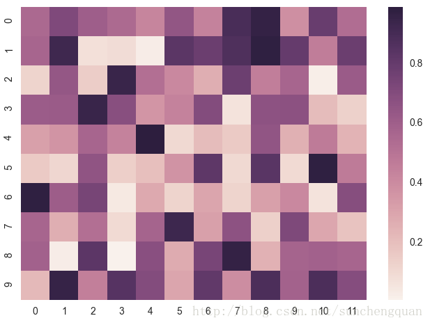 import numpy as np import seaborn as sns import matplotlib.pyplot as plt sns.set() np.random.seed(0) uniform_data = np.random.rand(10, 12) ax = sns.heatmap(uniform_data) plt.show()