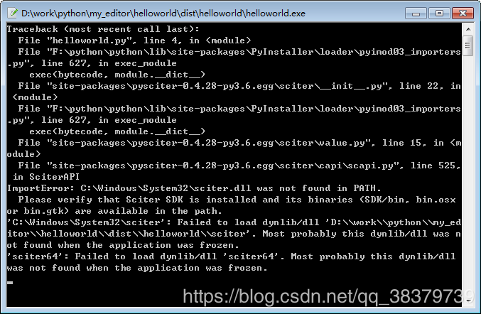 再次打包执行exe文件,能看到报错信息了,如下图。其中的核心信息是“ImportError: C:\Windows\System32\sciter.dll was not found in PATH”,即缺少sciter.dll文件。