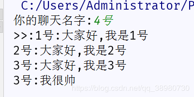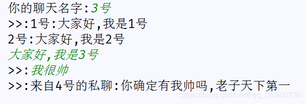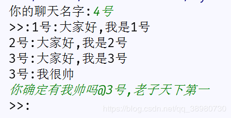 import lib.common from concurrent.futures import ThreadPoolExecutor c=socket.socket() ip_host=('127.0.0.1',8000) c.connect(ip_host) def send_msg(c,name): while True: msg = input ('>>:').strip () is_siliao=False if not msg: continue # if msg.startswith('@'): if '@'in msg: is_siliao=True dic = {'msg': msg,'name':name,'is_siliao':is_siliao} lib.common.send_dic(c,dic) if msg=='exit': c.close () break def get_msg(c): while True: dic=lib.common.get_dic(c) if dic['is_siliao']==True: print('来自%s的私聊:%s'%(dic['name'],dic['msg'])) continue print('%s:%s'%(dic['name'],dic['msg'])) t=ThreadPoolExecutor() name=input('你的聊天名字:').strip() c.send(name.encode('utf-8')) t.submit(send_msg,c,name) t.submit(get_msg,c)