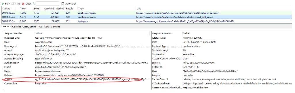 首先在火狐浏览器上登录知乎,然后使用火狐浏览器插件 Httpfox 获取 GET 请求的Cookie,这里注意使用状态值为 200(获取成功)的某次GET.