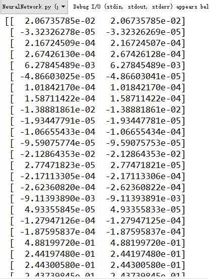 # 检验梯度是否计算正确 # 检验梯度是否计算正确 def checkGradient(Lambda = 0): '''构造一个小型的神经网络验证,因为数值法计算梯度很浪费时间,而且验证正确后之后就不再需要验证了''' input_layer_size = 3 hidden_layer_size = 5 num_labels = 3 m = 5 initial_Theta1 = debugInitializeWeights(input_layer_size,hidden_layer_size); initial_Theta2 = debugInitializeWeights(hidden_layer_size,num_labels) X = debugInitializeWeights(input_layer_size-1,m) y = 1+np.transpose(np.mod(np.arange(1,m+1), num_labels))# 初始化y y = y.reshape(-1,1) nn_params = np.vstack((initial_Theta1.reshape(-1,1),initial_Theta2.reshape(-1,1))) #展开theta '''BP求出梯度''' grad = nnGradient(nn_params, input_layer_size, hidden_layer_size, num_labels, X, y, Lambda) '''使用数值法计算梯度''' num_grad = np.zeros((nn_params.shape[0])) step = np.zeros((nn_params.shape[0])) e = 1e-4 for i in range(nn_params.shape[0]): step[i] = e loss1 = nnCostFunction(nn_params-step.reshape(-1,1), input_layer_size, hidden_layer_size, num_labels, X, y, Lambda) loss2 = nnCostFunction(nn_params+step.reshape(-1,1), input_layer_size, hidden_layer_size, num_labels, X, y, Lambda) num_grad[i] = (loss2-loss1)/(2*e) step[i]=0 # 显示两列比较 res = np.hstack((num_grad.reshape(-1,1),grad.reshape(-1,1))) print res