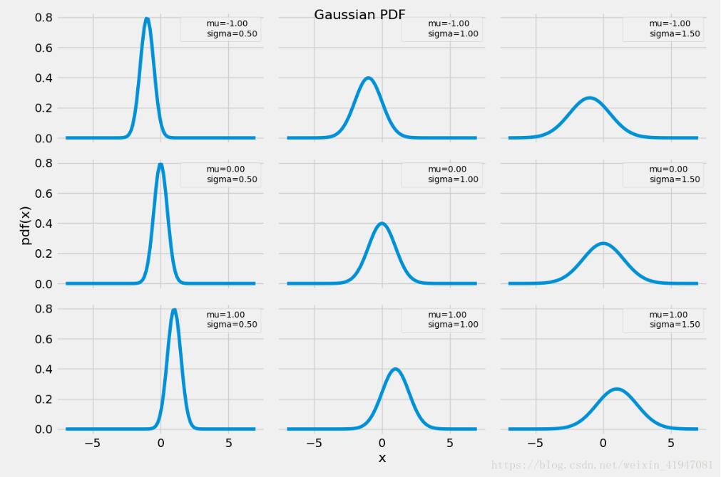 ax[i, j].plot(0,0, label='mu={:3.2f}\nsigma={:3.2f}'.format(mu,sd), alpha=0)