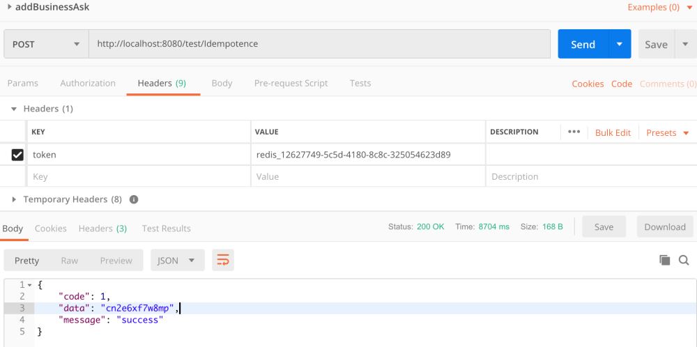 第二次请求,返回到是重复性操作,可见重复性验证通过,再多次请求到时候我们只让其第一次成功,第二次就是失败: