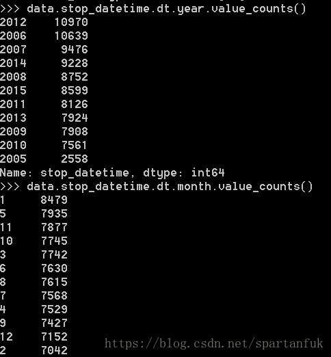 data.stop_datetime.dt.year.value_counts() data.stop_datetime.dt.month.value_counts()