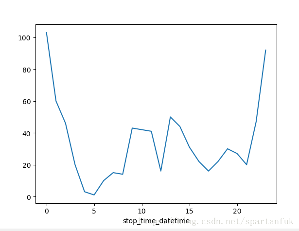 data['stop_time_datetime'] = pd.to_datetime(data.stop_time) data.groupby(data.stop_time_datetime.dt.hour).drugs_related_stop.sum().plot()