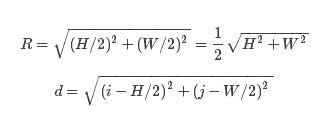 其中 i,ji,j 表示图像上任何一点的坐标,以左上角为坐标原点,dd 表示 图像上任何一点 到图像中心点的距离,RR 表示图像的半径。假设图像的高为 HH 宽为 WW