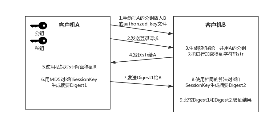 对于上诉的缺陷,SSH有两种解决方法,第一种是基于口令的认证;另一种是基于公钥的认证,俗称SSH免密登录。