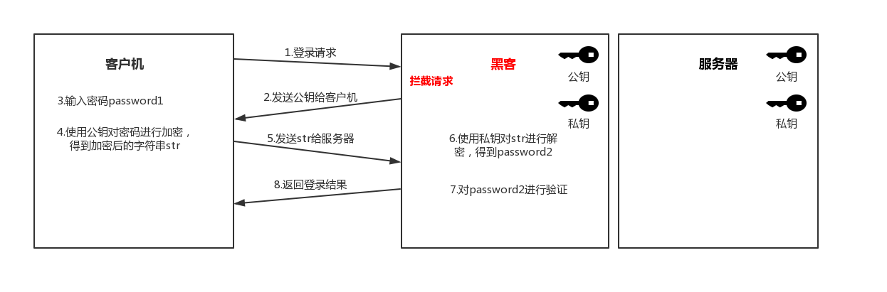 非对称加密就一定安全了么?答案是否定的。如果黑客冒充了服务器,拦截了登录请求,并且把自己的公钥发送给客户机,再使用自己的私钥对密码进行解密,就会获取到客户机的登录信息,从而造成数据泄露,这就是中间人攻击,详情见下图。