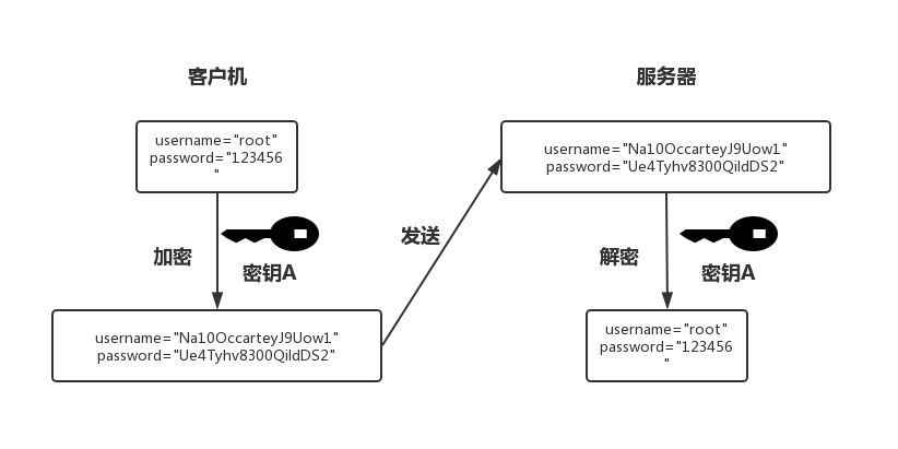 所谓的对称加密就是客户端与服务器共用一套密钥进行数据的加解密,详情见下图。