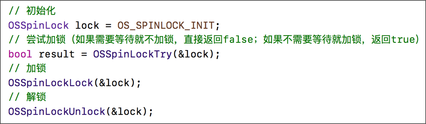 OSSpinLock // 缺点:可能出现优先级反转 已经不再安全 苹果也不推荐使用