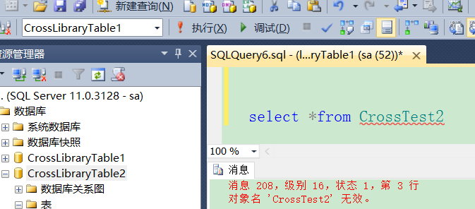 切换到CrossLibraryTable1下面查询CrossLibraryTable2的数据可以看到报如下错误