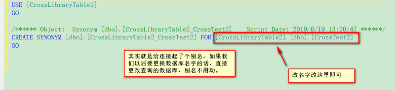 PS:像上面那样是可以进行查询,然而在项目中使用上面的代码格式就会引发一些问题,那什么问题呢?比如另一个数据库的名称改变了,我们就需要把所有用到这个的地方都得改掉,这样就很麻烦,那么有什么解决方案么,使得改一处就好了?当然有,用数据库同义词就可以轻松搞定!