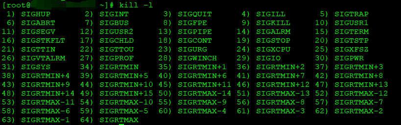 进程A需要进程B做点事,而进程间的内存区域某种意义上说是互不可见的。这个时候就需要通过信号量来完成。进程A可以按照预先定义的信号量规范向进程B发出信号量,当进程B收到后,根据具体信号量的值决定处理逻辑。具体信号量清单,可以在命令行通过如下命令查询。命令中均为字母,没有数字1。