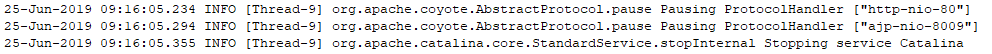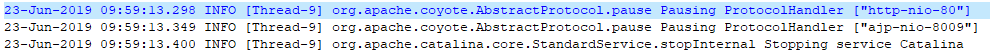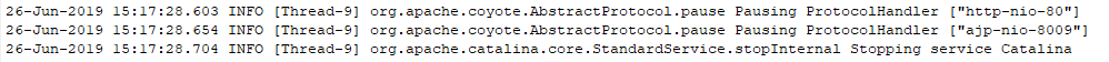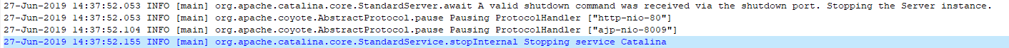从日志上看,tomcat收到了退出请求,并按照要求关闭容器。那么是否可以认为是有人执行了shutdown.sh呢?并不能。执行了shutdown脚本的关闭日志是这样的。