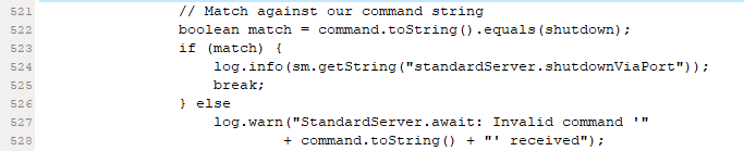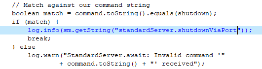 那么,现在的证据说明,这个tomcat不是通过SHUTDOWN报文关闭的。而且,从下图来看,也颇能说明这个SHUTDOWN指令不是这么容易发成功的。