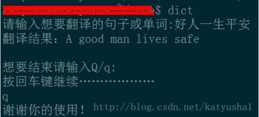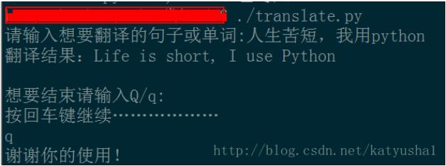 OK,完美运行,但是细细一看,似乎还不完美,因为每次都要切换到文件所在目录才能运行,为了更方使用程序,我们可以将translate.py连接到/usr/bin,或者/usr/local/bin,等等配置了系统环境变量的目录下