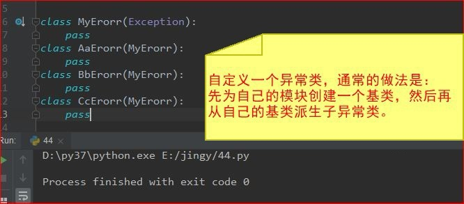 通常的做法是,先为自己的模块创建一个基类,然后再从此基类派生其他异常类,这样不但清晰明了,也方便管理: