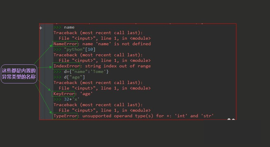 运行代码时有时会出现各种各样的错误,致使解析器中断执行,并提示xxxxxxErorr的提示,后面跟具体的错误的描述,这被称为是引发了异常。