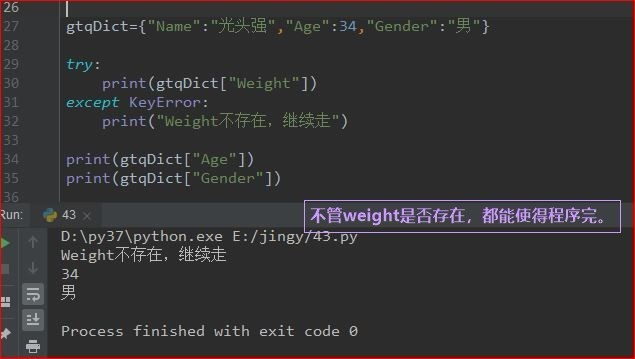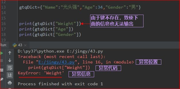 例如:有一个字典personDetail={"name":“光头强”}里边是光头强的资料,想取到它的资料,但具体都有什么资料我们不知道,如果输入的键不存在就会引发异常而中断执行。致使后面的代码也为无法执行。