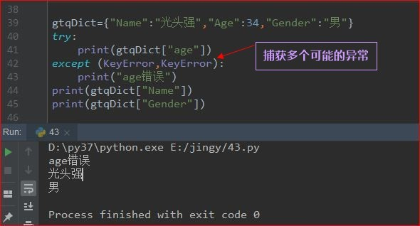 有时不确定会发生哪种异常,就把异常类型以元组的形式组包统统放在except后面,来匹配可能发生的异常: