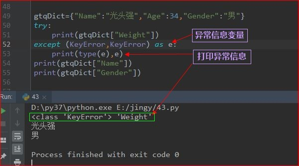 比如:要打印光头强年龄的Age键,不确定这个键是否存在,就用KeyErorr,不确定会不会发生键名是否正确,就用NameErorr。