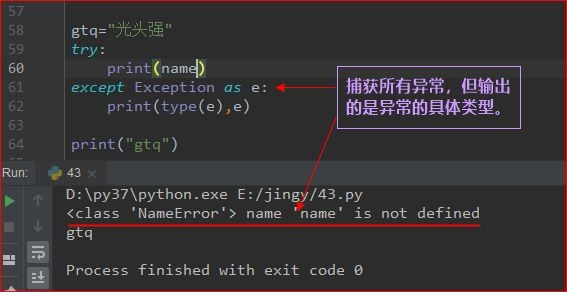 3)执行 except 子句 ,如果引发异常的类型和 except 关键字后面的异常匹配,就是捕获了异常,执行except子句。