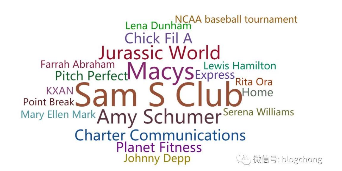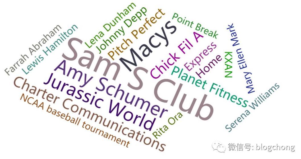 name =['Sam S Club', 'Macys', 'Amy Schumer', 'Jurassic World', 'Charter Communications', 'Chick Fil A', 'Planet Fitness', 'Pitch Perfect', 'Express', 'Home', 'Johnny Depp', 'Lena Dunham', 'Lewis Hamilton', 'KXAN', 'Mary Ellen Mark', 'Farrah Abraham', 'Rita Ora', 'Serena Williams', 'NCAA baseball tournament', 'Point Break']
