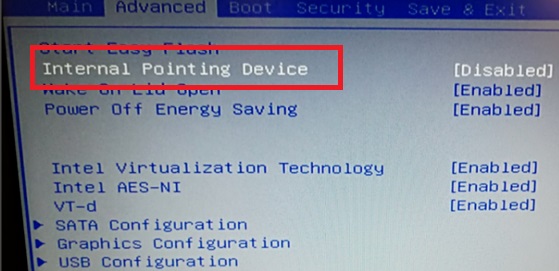 3、在其中将“intenal pointing device”改为“disabled”即可。