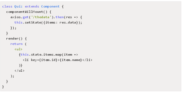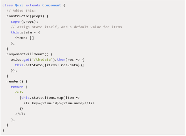 - 当异步获取数据时,不管它是在构造函数 componentWillMount 还是 componentDidMount 中获取的,组件在数据加载之前至少会呈现一次,当 Quiz 第一次呈现时, this.state.items 是 undefined。