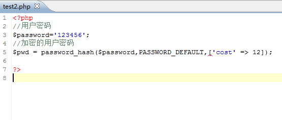 使用password_hash()方法对密码进行加密,这是目前PHP最为安全的加密方式。假如用户密码为123456,加密方式如下: